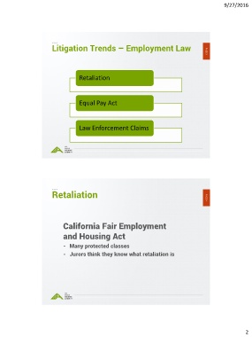 PAGE 3 9/27/2016 PAGE 4Litigation Trends – Employment Law Retaliation Equal Pay Act Law Enforcement Claims Retaliation California Fair Employment and Housing Act - Many protected classes - Jurors think they know what retaliation is 2