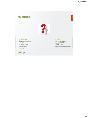 Questions PAGE 27 9/27/2016 + Michael + Carl PChoietftClaims Officer – FSheasreshoelndedr,ePnorter CSAC EIA Scott 916.850.7300 916.929.1481 mpott@csac- cfessenden@porterscott.c eia.org om 14