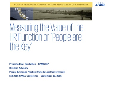 Measuring the Value of the HR Function or “People are the Key” Presented by: Ken Millen – KPMG LLP Director, Advisory People & Change Practice (State & Local Government) Fall 2016 CPAAC Conference – September 30, 2016