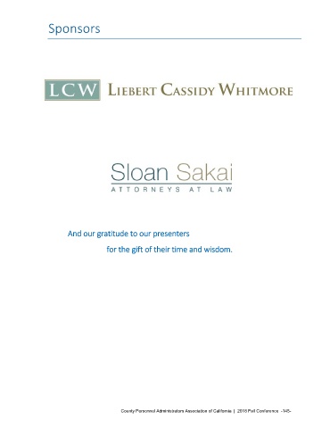 Sponsors And our gratitude to our presenters for the gift of their time and wisdom. County Personnel Administrators Association of California | 2018 Fall Conference -145-