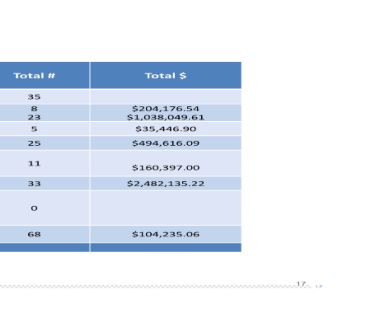 TotalĀ # TotalĀ $ 35 $204,176.54 8 $1,038,049.61 23 5 $35,446.90 25 $494,616.09 $160,397.00 11 $2,482,135.22 33 $104,235.06 0 68 17 17