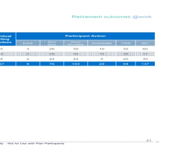 Retirement outcomes vidual Participant Action eting ndees Enroll Save Asset Consolidate TRAK RST More Allocation 75 3 10 35 60 3 26 39 10 34 47 64 2 25 30 48 8 26 40 9 94 137 29 87 24 24 76 103 nly – Not for Use with Plan Participants 21 21