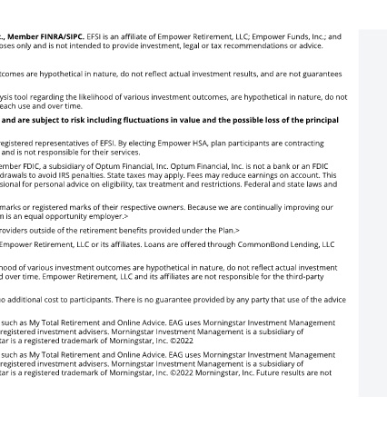 Empower Advisory Services refers to the advisory services offered by Empower Advisory Group, LLC, such as My Total Retirement and Online Advice. EAG uses Morningstar Investment Management