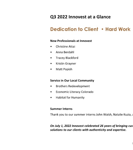 Hard Work • Honesty & Integrity Innovest participated in the Brothers Redevelopment “Paint-a-thon” Innovest hosted a one-day “Invest in Girls” summer symposium with Economic Literacy Colorado Thank you to our summer interns John Walsh, Natalie Kuzia, and Nick Mancini! Innovest employees volunteered with Habitat for Humanity On July 1, 2022 Innovest celebrated 26 years of bringing custom, innovative 2