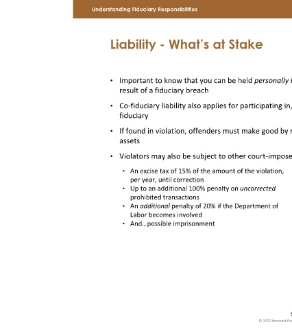 • Important to know that you can be held personally liable as a plan fiduciary for any losses incurred as a