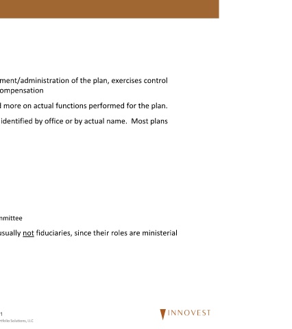• Fiduciary status is based less on any named role and more on actual functions performed for the plan.