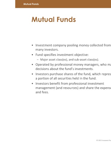 many investors. Fund specifies investment objective: –Major asset class(es), and sub‐asset class(es). •Operated by professional money managers, who make decisions about the fund’s investments. •Investors purchase shares of the fund, which represent a portion of all securities held in the fund. •Investors benefit from professional investment management (and resources) and share the expenses and fees.