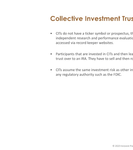 • CITs do not have a ticker symbol or prospectus, thus limiting a participant’s ability to conduct
