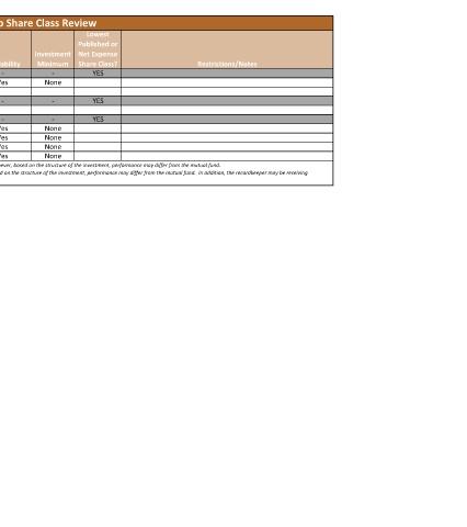 Availability ‐ Yes ‐ ‐ Yes Yes Yes Yes * Separate Accounts (SA) may be included in this Share Class Review. SA’s listed have been through our due diligence process. However, based on the structure of the investment, performance may differ from the mutual fund. In addition, the recordkeeper may be receiving