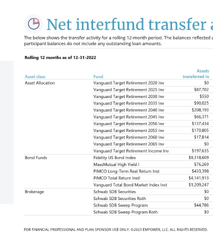 The below shows the transfer activity for a rolling 12-month period. The balances reflected are based on all actively employed and separated from service plan participants. The