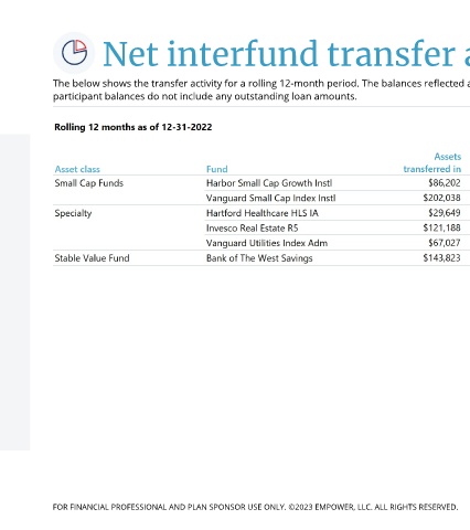 The below shows the transfer activity for a rolling 12-month period. The balances reflected are based on all actively employed and separated from service plan participants. The