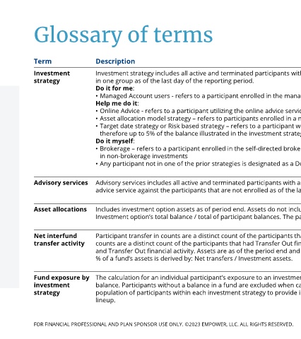• Target date strategy or Risk based strategy – refers to a participant with greater than 95% of their assets in one or two target date or risk based fund(s);