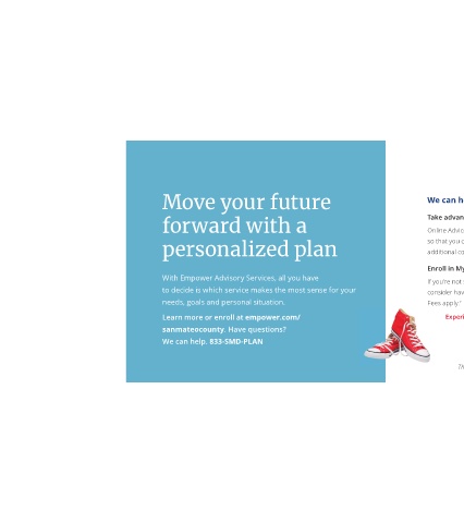 forward with a Move your future Take advantage of Online Advice 1 See where you stand with Online Advice gives you saving and investment recommendations a personalized analysis so that you can take the reins. This option is available at no We’ve analyzed your account additional cost to you. personalized plan to identify where you could improve your readiness for Enroll