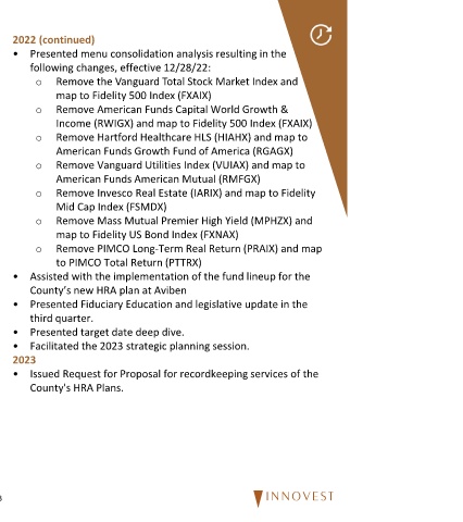 Innovest’s Retained Innovest Portfolio Solutions for retirement plan consulting services, effective January 1, 2022. Share class merger of the Vanguard Target Retirement series, reducing the expense ratio to 0.08% effective February 11, Presented the annual Fee Review for the 457 plan Presented the Investment Policy Statement Presented manager searches for small cap value and small cap growth, resulting in the following ch