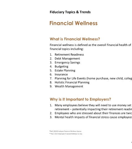 Fiduciary Topics & Trends Financial Wellness What is Financial Wellness? financial topics including: Retirement Readiness 1. Debt Management 2. Emergency Savings 3. Budgeting 4. Estate Planning 5. Insurance 6. 7. Holistic Financial Planning 8. Wealth Management 9. Why is It Important to Employers? 1. retirement – 2. 3. *PwC 2019 Employee Financial Wellness Survey **PwC 2022 Employee Financia