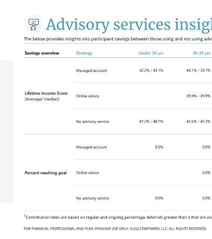 The below provides insights into participant savings between those using and not using advisory services. Only actively employed and eligible participants with a balance are included.