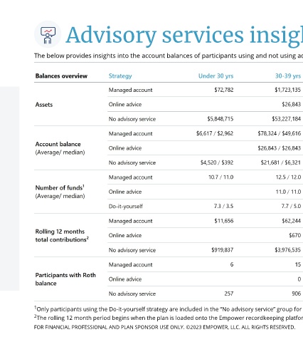 The below provides insights into the account balances of participants using and not using advisory services. All participants with a balance are included.