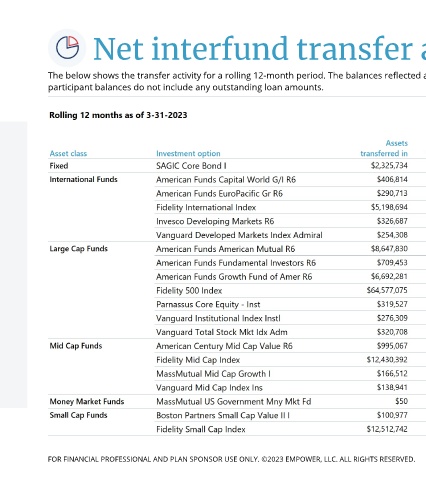 The below shows the transfer activity for a rolling 12-month period. The balances reflected are based on all actively employed and separated from service plan participants. The