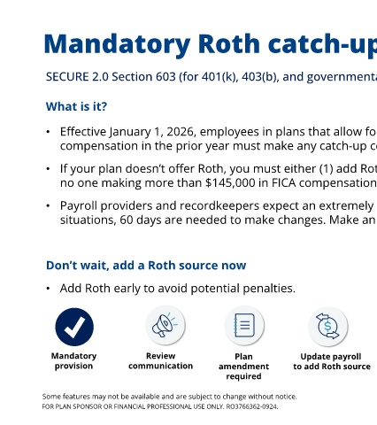 • If your plan doesn’t offer Roth, you must either (1) add Roth, (2) remove the catch-up provision, or (3) certify you have