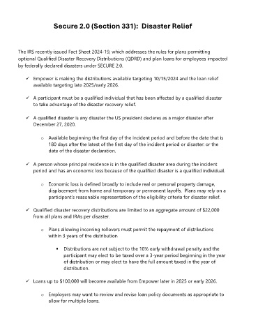optional Qualified Disaster Recovery Distributions (QDRD) and plan loans for employees impacted