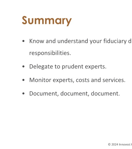 Summary • Know and understand your fiduciary duties and responsibilities. • Delegate to prudent experts. • Monitor experts, costs and services. • Document, document, document. © 2024 Innovest Portfolio Solutions 33