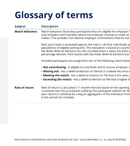 Match behaviors Match behaviors illustrates participants that are eligible for employer match and the different levels at which they are utilizing their available match benefits. It