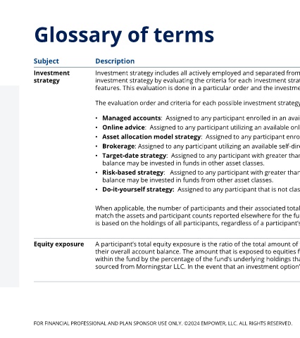 • Risk-based strategy: Assigned to any participant with greater than 95% of their balance invested in one or two risk-based funds. 5% of their remaining