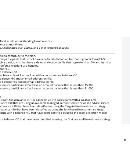 • Participant assets: Total of all participant balances. It does not include plan level assets or outstanding loan balances.