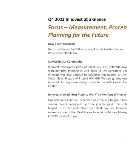 Focus – New Team Members Retirement Plan Team. Service in Our Community employees Innovest firm our with also was Innovest Shop, Claus Santa clothing donated Center. company's Our clients, serving attract us helped of one as named 9th the for 2023 in