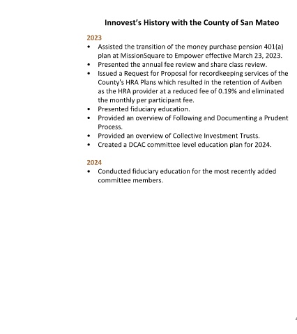 Innovest’s Assisted the transition of the money purchase pension 401(a) plan at MissionSquare Presented the annual fee review and share class review. Issued a Request for Proposal for recordkeeping services of the County's HRA Plans which resulted in the retention of Aviben as the HRA provider at a reduced fee of 0.19% and eliminated the monthly per participant fee. Presented fiduciary education. Provided an overvie