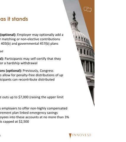 Fiduciary Topics & Trends Legislative Update: SECURE 2.0 Provisions Effective 2023 amounts to the plan within three years Provisions Effective 2024 from $5,000)