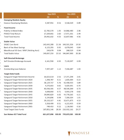 Emerging Markets Equity Invesco Developing Markets Fixed Income Fidelity US Bond Index PIMCO Total Return Total Fixed Income Stable Value SAGIC Core Bond Bank of the West Savings MassMutual US Govt. MMF (Holding Acct) Total Stable Value Self-Directed Brokerage Self Directed Brokerage Account Outstanding Loan Balance Target Date Funds Vanguard Target Retirement Income Vanguard Target Retirement 2020 Va