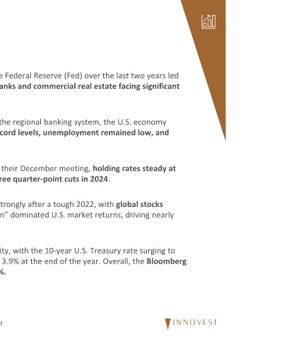 Recap of 2023 to some cracks in the economy – challenges. inflation began to moderate. • gaining over 21% in 2023. two‐thirds of the S&P 500’s returns in the year. Aggregate Bond Index finished the year up ~5.5%.