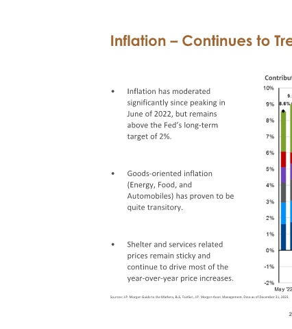 Inflation – Inflation has moderated • significantly since peaking in June of 2022, but remains above the Fed’s long‐term target of 2%. Goods‐oriented inflation • (Energy, Food, and Automobiles) has proven to be quite transitory. Shelter and services related • prices remain sticky and continue to drive most of the year‐over‐year price increases. Sources: J.P. Morgan Guide to the Markets, BLS, FactSet,