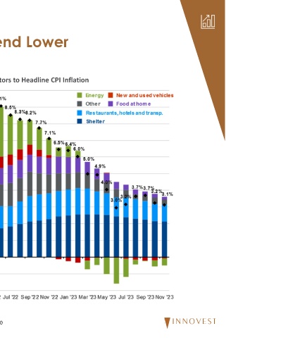 Inflation – Inflation has moderated • significantly since peaking in June of 2022, but remains above the Fed’s long‐term target of 2%. Goods‐oriented inflation • (Energy, Food, and Automobiles) has proven to be quite transitory. Shelter and services related • prices remain sticky and continue to drive most of the year‐over‐year price increases. Sources: J.P. Morgan Guide to the Markets, BLS, FactSet,