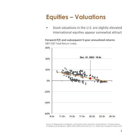 Valuations Forward P/E and subsequent 5‐year annualized returns Sources: J.P. Morgan Guide to the Markets,. (Left) FactSet, Refinitiv Datastream, Standard & Poor’s, Thompson Reuters, J.P. Morgan Asset Management. (Right) FactSet, MSCSI, Standard & Poor’s, J.P. Morgan Asset Management. Data as of December 31, 2023.