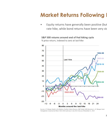 • S&P 500 returns around end of Fed hiking cycle % price return, indexed to zero at last hike Sources: J.P. Morgan Guide to the Markets, FactSet, Federal Reserve, S&P Global, LSEG Datastream, J.P. Morgan Asset Management. Assumes last hike of 2022‐2023 cycle was in July 2023. Data as of December 31, 2023