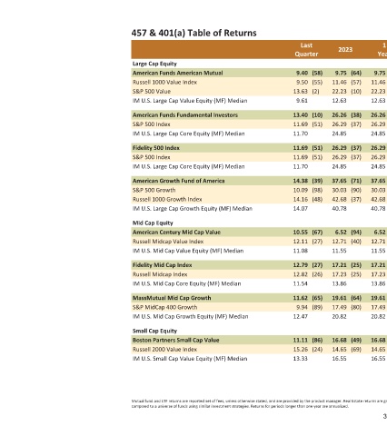 457 & 401(a) Table of Returns Large Cap Equity American Funds American Mutual Russell 1000 Value Index S&P 500 Value IM U.S. Large Cap Value Equity (MF) Median American Funds Fundamental Investors S&P 500 Index IM U.S. Large Cap Core Equity (MF) Median Fidelity 500 Index S&P 500 Index IM U.S. Large Cap Core Equity (MF) Median American Growth Fund of America S&P 500 Growth Russell 1000 Growth Index IM U.S. Large