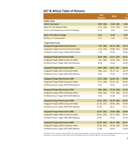457 & 401(a) Table of Returns Stable Value SAGIC Core Bond Ryan 3 Yr GIC Master Index IM U.S. GIC/Stable Value (SA+CF) Median Bank of the West Savings 90 Day U.S. Treasury Bill Target Date Funds Vanguard Target Retirement Income Vanguard Target Income Composite Index IM Mixed-Asset Target Today (MF) Median Vanguard Target Retirement 2020 Vanguard Target 2020 Composite Index IM Mixed-Asset Target 2020 (MF) Median