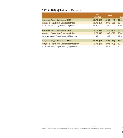 457 & 401(a) Table of Returns Vanguard Target Retirement 2055 Vanguard Target 2055 Composite Index IM Mixed-Asset Target 2055 (MF) Median Vanguard Target Retirement 2060 Vanguard Target 2060 Composite Index IM Mixed-Asset Target 2060 (MF) Median Vanguard Target Retirement 2065 Vanguard Target 2065 Composite Index (Net) IM Mixed-Asset Target 2065+ (MF) Median compared to a universe of funds using similar investment