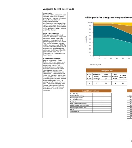 Vanguard Target Date Funds Organization: Founded in 1975, Vanguard’s total AUM has eclipsed the $4 trillion mark across more than 240 mutual funds. The foundation of Vanguard’s investment methodology is based around low- cost indexed mutual funds. Day-to- day management of the target date series is overseen William Coleman and Walter Nejman. Glide Path Rationale: With approximately 50% equity exposure at