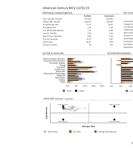 American Century MCV 12/31/23 PORTFOLIO CHARACTERISTICS Wtd. Avg. Mkt. Cap $M Median Mkt. Cap $M Price/Earnings ratio Price/Book ratio 5 Yr. EPS Growth Rate (%) Current Yield (%) Beta (5 Years, Monthly) % in Int'l Securities Active Share Number of Stocks SECTOR ALLOCATION 3.9 Communication Services 3.3 2.4 Consumer Discretionary Consumer Staples 3.9 4.9 Energy 5.8 Financials Health Care 6.9 Industr