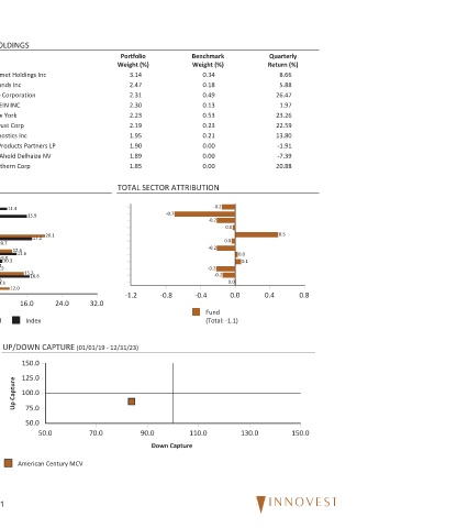 TOP 10 HOLDINGS Zimmer Biomet Holdings Inc Conagra Brands Inc The Allstate Corporation HENRY SCHEIN INC Bank of New York Northern Trust Corp Quest Diagnostics Inc Enterprise Products Partners LP Koninklijke Ahold Delhaize NV Norfolk Southern Corp 7.6 11.4 7.0 5.2 0.1 9.7 7.9 12.6 13.6 9.9 10.3 8.4 8.9 15.3 8.5 9.3 12.0 0.0 16.0 8.0 0.0 Fund Up Capture 51