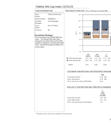 Fidelity Mid Cap Index 12/31/23 FUND INFORMATION Fidelity Investments Fund Family : 09/08/2011 Fund Inception : Team Managed Portfolio Manager : $31,172 Million Total Assets : 9% Turnover : Investment Strategy: The Fund tracks the Russell Mid Cap Index. The Russell Mid Cap Index measures the performance of the 800 smallest companies in the Russell 1000 Index, representing approximately 26% of that Index. *I