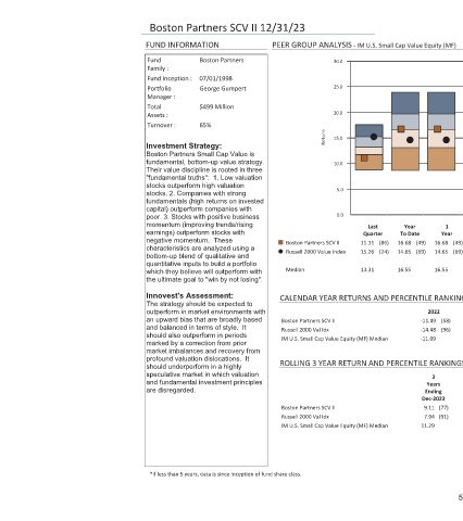 Boston Partners SCV II 12/31/23 FUND INFORMATION Boston Partners Fund Family : 07/01/1998 Fund Inception : George Gumpert Portfolio Manager : $499 Million Total Assets : 65% Turnover : Investment Strategy: Boston Partners Small Cap Value is fundamental, bottom-up value strategy. Their value discipline is rooted in three "fundamental truths": 1. Low valuation stocks outperform high valuation stocks. 2. Compani