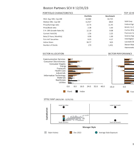 Boston Partners SCV II 12/31/23 PORTFOLIO CHARACTERISTICS Wtd. Avg. Mkt. Cap $M Median Mkt. Cap $M Price/Earnings ratio Price/Book ratio 5 Yr. EPS Growth Rate (%) Current Yield (%) Beta (5 Years, Monthly) % in Int'l Securities Active Share Number of Stocks SECTOR ALLOCATION 2.9 Communication Services 2.6 10.3 Consumer Discretionary 2.3 Consumer Staples 2.7 10.1 Energy 10.8 Financials 5.1 Health Care