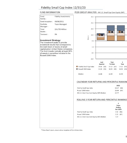 Fidelity Small Cap Index 12/31/23 FUND INFORMATION Fidelity Investments Fund Family : 09/08/2011 Fund Inception : Team Managed Portfolio Manager : $24,793 Million Total Assets : 9% Turnover : Investment Strategy: The investment seeks to provide investment results that correspond to the total return of stocks of small- capitalization United States companies. The fund invests normally at least 80% of assets in s