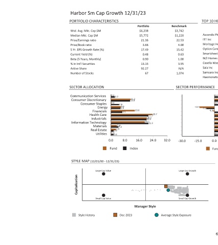 Harbor Sm Cap Growth 12/31/23 PORTFOLIO CHARACTERISTICS Wtd. Avg. Mkt. Cap $M Median Mkt. Cap $M Price/Earnings ratio Price/Book ratio 5 Yr. EPS Growth Rate (%) Current Yield (%) Beta (5 Years, Monthly) % in Int'l Securities Active Share Number of Stocks SECTOR ALLOCATION 0.0 2.2 Communication Services Consumer Discretionary 0.0 Consumer Staples 4.6 5.6 Energy 5.5 Financials 6.5 Health Care Industria