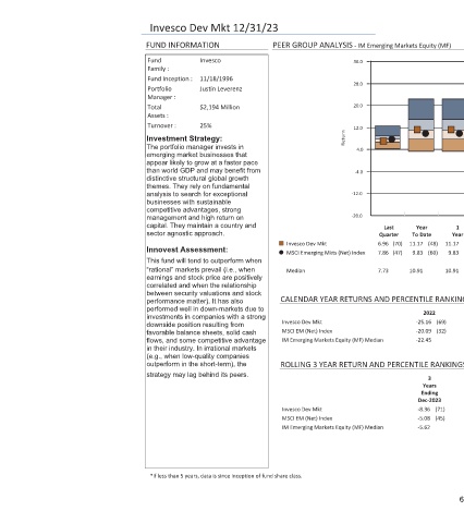 Invesco Dev Mkt 12/31/23 FUND INFORMATION Invesco Fund Family : 11/18/1996 Fund Inception : Justin Leverenz Portfolio Manager : $2,194 Million Total Assets : 25% Turnover : Investment Strategy: The portfolio manager invests in emerging market businesses that appear likely to grow at a faster pace than world GDP and may benefit from distinctive structural global growth themes. They rely on fundamental analysis