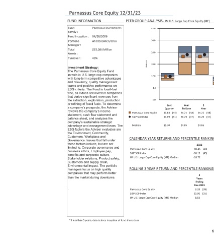 Parnassus Core Equity 12/31/23 FUND INFORMATION Parnassus Investments Fund Family : 04/28/2006 Fund Inception : Ahlsten/Allen/Choi Portfolio Manager : $15,084 Million Total Assets : 40% Turnover : Investment Strategy: The Parnassus Core Equity Fund invests in U.S. large cap companies with long-term competitive advantages and relevancy, quality management teams and positive performance on ESG criteria. The Fund